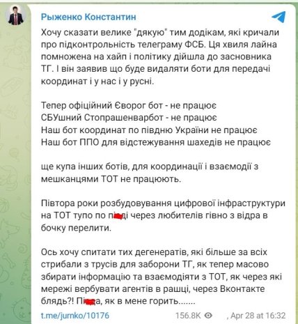 Риженко у своєму оригінальному повідомленні зазначив, що причина блокування полягає в тому, що заяви українських політиків про підконтрольність Telegram ФСБ дійшли до розробників месенджера, через що вони вирішили заблокувати всі боти для наведення. Як українські, так і російські.