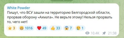“ЗСУ зайшли на територію Білгородської області і вже закріплюються. Військкори повідомляють, що ЗСУ прорвали оборону Ахмата”, — йдеться у повідомленні.
