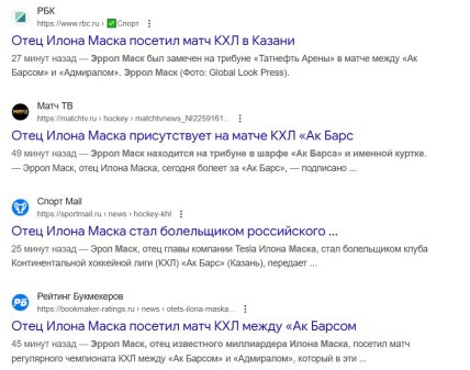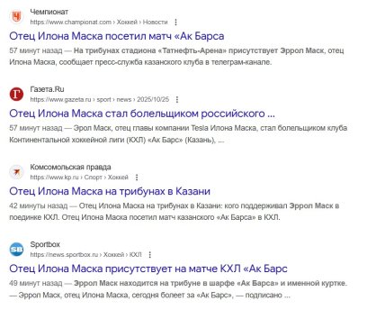 У суботу, 25 жовтня, у Казані (Росія) Еррол Маск, батько Ілона Маска, був помічений на матчі Континентальної хокейної ліги (КХЛ) “Ак Барс” — “Адмірал”. До речі, президент РФ Володимир Путін заявляв, що саме він вигадав КХЛ.