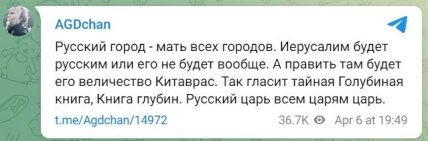 “Російське місто — мати всіх міст. Єрусалим буде російським або його не буде взагалі. А правити там буде його величність Китаврас. Так говорить таємна Голубина книга, Книга глибин. Російський цар усім царям цар”, — написав він.