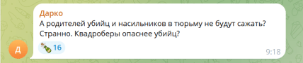“А батьків убивць і ґвалтівників у в’язницю не садитимуть? Дивно. Квадробери небезпечніші за вбивць?”.