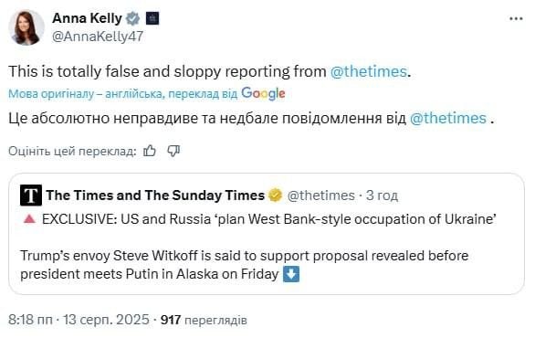 «Це абсолютно неправдива й недбало зроблена публікація від The Times», — написала у Х Анна Келлі.