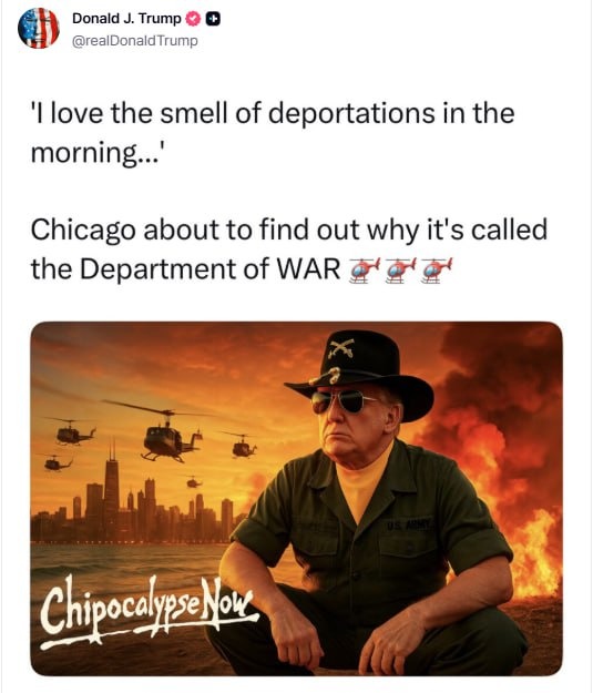«Я люблю запах депортацій вранці…». Чикаго збирається дізнатися, чому його називають Міністерством оборони США», — написав він.
