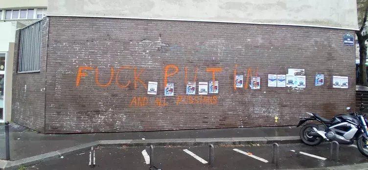 Поряд із антиросійськими графіті також написані заклики до справедливості у справі Ель-Хасена Діарри — чоловіка, який нещодавно помер у відділку поліції 20-го округу Парижа.