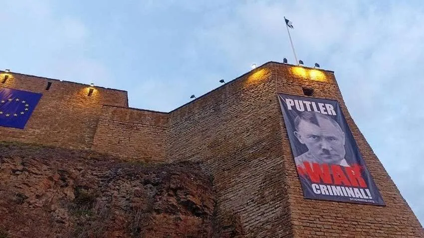 У місті Нарва, на самому кордоні з Росією, Естонія знову використала символічну форму протесту проти агресивної політики Кремля. Цьогоріч 9 травня на стіні Нарвського замку, яка виходить у бік Росії, з’явився великий банер, що порівнює Володимира Путіна з Адольфом Гітлером, повідомляє естонське видання ERR.