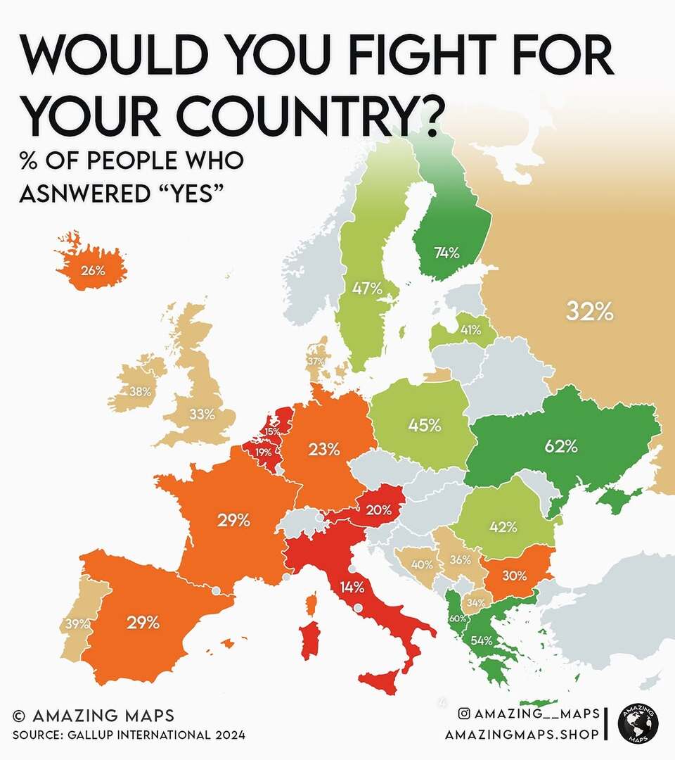 Асоціація Gallup International Association провела опитування у 45 країнах світу на тему: Чи готові ви воювати у разі нападу на вашу країну?