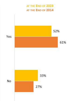• У 2014 році тих, хто відповів «Так!» на це запитання було 61% у світі, проти 52% у 2023 році.